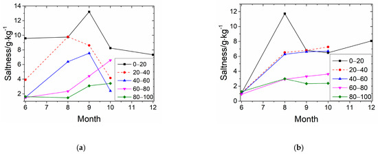 It can also be found that the total salt content was continuously increasing from June to October at the deeper layers (60–80 cm, 80–100 cm), which was closely related to the local irrigation rule and climate. After irrigation from March to May, the soil salt had been brought down to the deeper soil layers by the water, so the total soil salt in June was less. Then, it was gradually brought up by the water due to strong evaporation. After the autumn or winter irrigations in October or November, the soil salt near the surface layers had been brought down to the deeper layers. As a result, the salt content at the deep layers (60–80 cm, 80–100 cm) grew persistently.