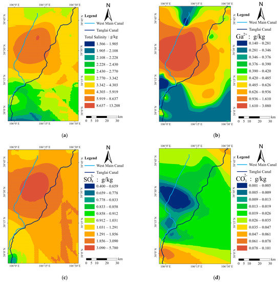 Spatial distribution of soil total salt and typical salt ions in the study area: (a) total salt, (b) Ca2+ (c) SO42− (d) CO32−.
