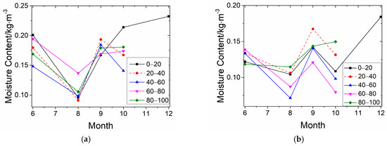 To investigate the change trend of soil water content in the study area, two sites in Nanliang farm and Pingjipu farm (Nan 10–2, Ping 8–1) were chosen to take soil samples at regular intervals in 2020. The water contents measured at the two sites were presented, as shown in Figure 5. In 2020, soil samples from five layers at the two sites were taken in June, August, September, October and December. In December, a soil sample was taken only from the surface layer (0–20 cm) due to frozen conditions at the deeper layers.