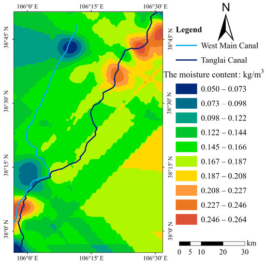 It can be found that the soil water content in the study area was relatively higher along the Tanglai Canal, but was relatively lower along the West Main Canal. The spatial distribution of the water content along the two canals was greatly nonuniform, conforming to the trend of “East high and west low, north high and south low”.