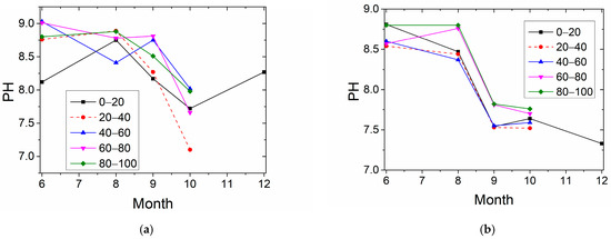 The measured pH value at two typical sites of Nanliang farm and Pingjipu farm (Nan 10–2 and Ping 8–1) in 2020 is shown in Figure 7.