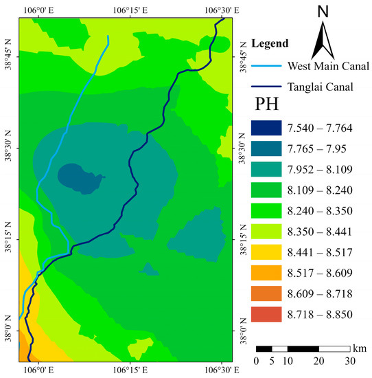 The data of the pH values measured in the study area in September 2020 were interpolated using the Kriging method, and the spatial distribution of the pH value was obtained, as shown in Figure 8. The soil pH value in the study area was greater than seven, showing a trend of “high at the upstream and downstream of the canals, low at the middle stream of the canals”.