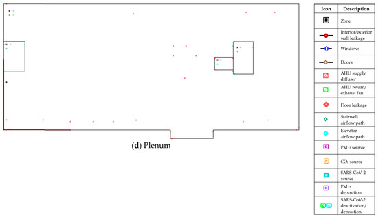 The building has been modeled in CONTAM, as shown in Figure 2, which displays the three-story building model. Plenums are considered separate floors with the same plan. In this model, interior and exterior wall and floor leakages are defined to calculate the airflow between the outdoor area and different zones and floors. Wall leakages are defined in three elevations to capture the stack effect [10].