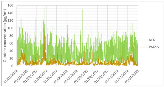 To ensure accuracy, a station near the case study area has been specifically selected as the source of this data. Furthermore, the same source [28] has been used to obtain the outdoor level of NO2. Figure 3 illustrates the amount of ambient PM2.5 and NO2 throughout 2022, as provided by AQE [28]. The ambient pollutants are associated with the model by defining a .CTM file in CONTAM. The penetration factor through the walls is assumed to be 1.0 [29].
