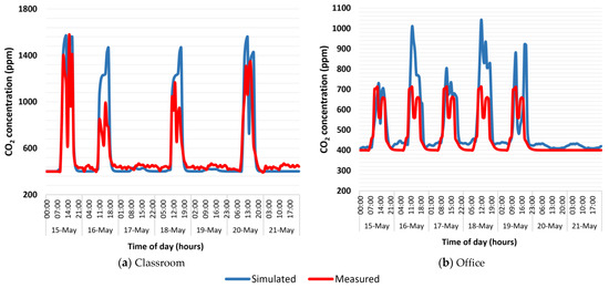 The comparison of the simulation results and measurements is illustrated in Figure 4. It can be observed from Figure 4 that the pattern of measured CO2 concentration in both zones aligns with the simulated results of the model. Moreover, two sets of statistical metrics have been calculated for both measured and simulated data.