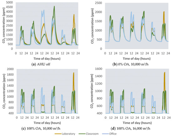Assuming a constant outdoor CO2 level of 400 ppm, incorporating 100% OA in ventilation is a positive step in diluting indoor CO2. This is shown in Figure 6, which presents the CO2 concentration in three selected zones with different occupancy schedules: a ground-floor office with up to six occupants, a first-floor classroom occupied four times a week with up to 30 occupants, and a second-floor laboratory fully occupied on Saturdays with up to 18 people and staff-only on other days.