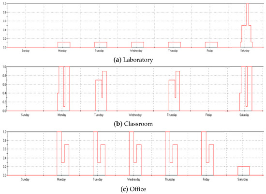 Occupancy schedule of selected zones: laboratory, classroom, and office.
