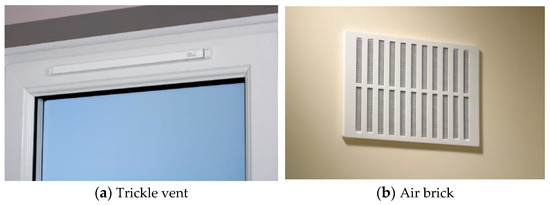 In order to solve this issue, two strategies are considered to be added to the model with increased ventilation rate (16,000 m3/h): 1—installing background ventilation, including trickle vents in windows and air brick vents in external walls, which allows in and out airflows between the zones and ambient environment (see Figure 8). 2—fully opening the doors.