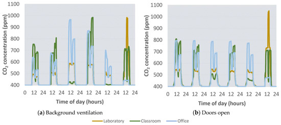 CO2 level in the laboratory, classroom, and office with background ventilation and opening the doors.