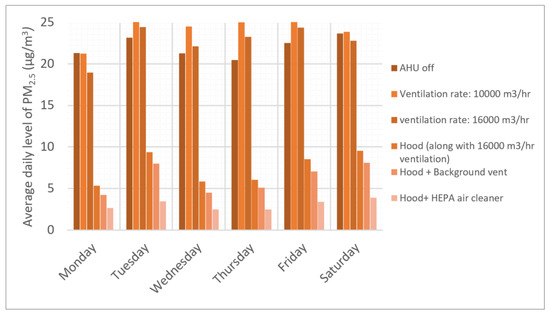 The daily average amount of PM2.5 is presented in Figure 11. As can be observed from Figure 11, the average PM2.5 level in the case without AHU is lower than the case with ventilation, as the operation of AHU with outdoor air brings in more PM2.5 from outdoors. However, when the AHU is inactive, the maximum level is 6% and 12% higher than the baseline and increased ventilation rate scenarios.