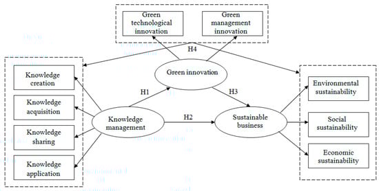 Knowledge management enables changes and innovations to lead to the improvement of the organization’s key competencies [52], and it is capable of solving contemporary environmental and socioeconomic problems [43]. Mikalauskienė and Atkočiūnienė [53] investigated the impact of knowledge management on sustainable development and concluded that organizations that aim to contribute to the creation of social well-being, the preservation of the environment and the creation of social health must create an environment suitable for the development of knowledge processes and the creation of innovation. Robinson et al. [54] attempted to consider the role of knowledge management in promoting sustainable business practices in the context of the construction industry by proposing a five-stage road map. According to [55], knowledge management enables the transfer of useful information and intellectual property and thus contributes to the sustainable operation of an organization. Wu et al. [56] showed that improving corporate sustainability and doing business according to sustainable development principles relies on knowledge management and creating strong links for knowledge exchange between the organization and the external environment. Shahzad et al. [57] pointed out the essential importance of acquiring knowledge in achieving sustainable development. There are various studies that have shown that knowledge management practices have a positive impact on green innovation [12,42] and on sustainable business results [58,59]. In [60], the authors showed that green innovation affects sustainable development by improving the production average and resource utilization, as well as improving the relationship between companies and stakeholders and increasing market shares. In [61], the results obtained showed the existence of a significant relationship between green innovation and environmental performance.