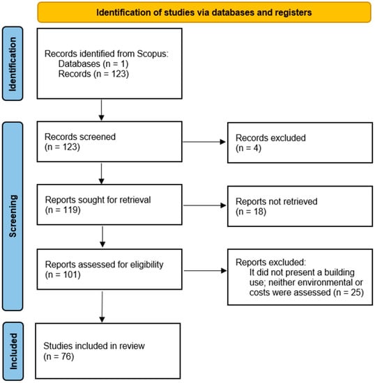 In this context, the Scopus database was used with the following descriptors: (((“life cycle assessment” OR “life cycle anal*” OR “life-cycle assessment” OR “life-cycle anal*” OR “life cycle analysis” OR “life cycle assessment”) AND ((“rainwater” OR “rain-water” OR “stormwater” OR “storm-water” OR “rainwater” OR “rainwater”) AND (“harvest*” OR “catch” OR “capture”)))), generating a total of 109 documents as of 10 May 2023. Fourteen documents were included from other sources, given their relevance and compatibility. The final screening encompassed a total of 123 documents.