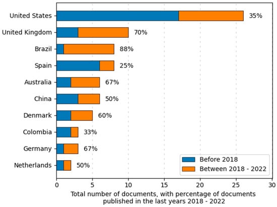 Initially, the 76 selected documents were formatted into CSV and Bib formats to facilitate use with the chosen tools. Metadata of the documents, such as country of origin, document language, authors, citations, affiliations, keywords and year of publication, were systematically organised for trend visualisation. Figure 2 illustrates the number of publications by country and the evolution over the last five years of available data (2018–2022). The United States had the highest production, followed by the United Kingdom, Brazil and Spain. In the last five years, Brazil showed the most substantial growth in the percentage of publications, while the United States led in the sheer quantity of publications, with nine documents. The selected articles are listed in Table S1 in the Supplementary data.