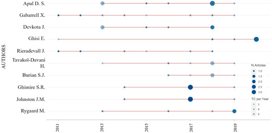 Regarding authors, Figure 3 presents the publication trend among the leading authors in the field. The size of the circle corresponds to the number of published articles (larger stands for more published articles) and the circle’s colour corresponds to the number of citations the author had (darker stands for more citations). Apul and Gabarrell were the most prolific, with eight papers each. Eight other authors followed closely with five or six papers, demonstrating a variety of high-producing contributors on the subject. A marked increase in production between 2018 and 2022 is also noteworthy, as depicted in Figure 2.