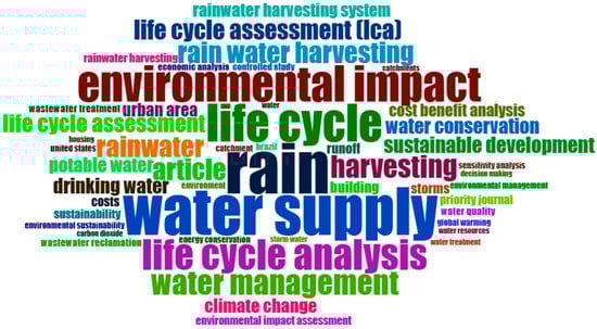 A word cloud analysis revealed additional contexts beyond those suggested by keyword sequences. The first analysis highlighted the presence of cost-related terms, likely about the life cycle cost assessment (LCCA) theme. The second analysis included terms related to climate change or global warming. The presence of terms related to wastewater indicates a focus and interest in using lower-quality water reuse systems. Figure 4 shows the keyword cloud derived from the selected articles. Moreover, other decision-making contexts, such as management, resources, treatment and conservation, emerged as facets of a science-based approach to future water asset decisions.