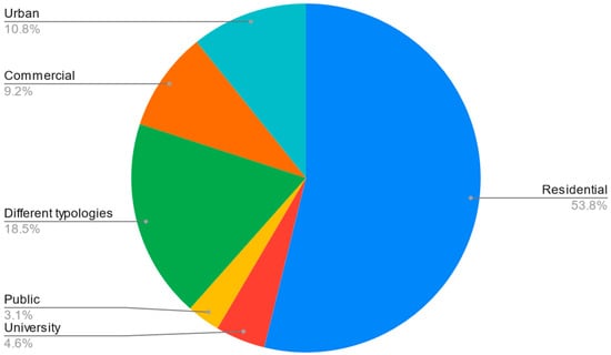 Another issue verified in the articles listed for the study was the building typology. More than half of the articles focused on the residential typology (53.8%), such as the studies by Abas and Mahlia [34], Zanni et al. [35], Vialle et al. [36], Rashid et al. [37] and Jeong et al. [38]. Some articles encompassed different typologies in the same study (18.5%), and others considered the urban scale (10.8%), involving different typologies. Some authors have conducted studies in other typologies, such as commercial [14,39,40], which added up to 9.2% of the articles, and public, with 3.1% [30,31]. Studies were also observed in universities [27,41,42], representing 4.6%. Figure 5 summarises the types of buildings found in the selected studies.