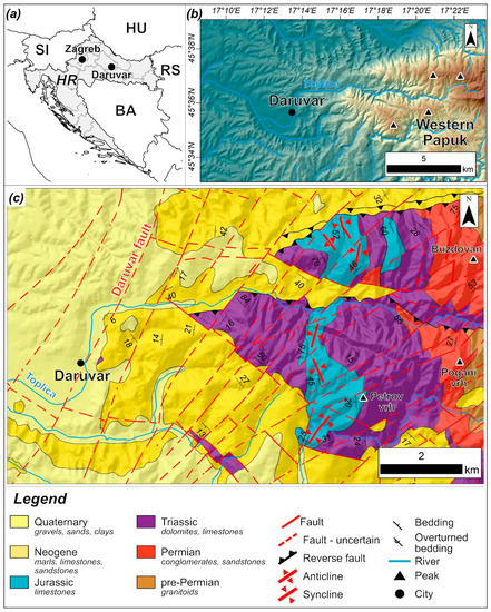 The study area (western Papuk Mt.; Figure 1b) is located at the SW margin of the PBS. The PBS is a system of basins characterized by a complex polyphase deformation history that developed parallel with the Alpine–Dinarides–Carpathian orogen. The Croatian part of the PBS [47,48,49,50] was affected by an initial E-W extensional tectonic phase during the Early to Middle Miocene that formed systems of grabens and half-grabens, i.e., regional depressions (e.g., Drava and Sava depressions; [47]). The initial extension was followed by a Middle Miocene local scale compression and a Middle to Late Miocene deepening of the basin system due to crustal thermal subsidence. Tectonic inversion and structural reactivation commenced during the Pliocene–Quaternary, which enabled the regional compression/transpression of existing structures as a result of the continuous Adria–Europe plates collision and the general N-S compression [51]. The present-day structural setting of the Papuk area is mostly affected by the last Pliocene–Quaternary deformational phase characterized by compression/transpression [52]. The N-S compression caused the reactivation of two regional dextral faults, producing a conjugated fault set composed of NW-SE dextral and NE-SW sinistral faults in their interaction zone [52]. Progressive regional transpression was accommodated by folding and uplifting of the structures along the sinistral strike-slip faults. One of those sinistral faults is the Daruvar fault (Figure 1c), which affected the local geological and structural settings of the Daruvar spring area.