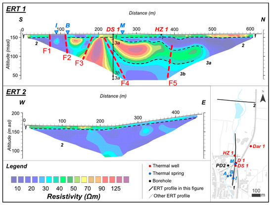 Figure 4 shows the profiles with spacing between electrodes of 10 m providing a general overview of the spring area (i.e., ERT 1) and its surroundings (i.e., ERT 2). Data inversion resulted in an RMS error of 7% and 2.5% for ERT 1 and ERT 2, respectively.