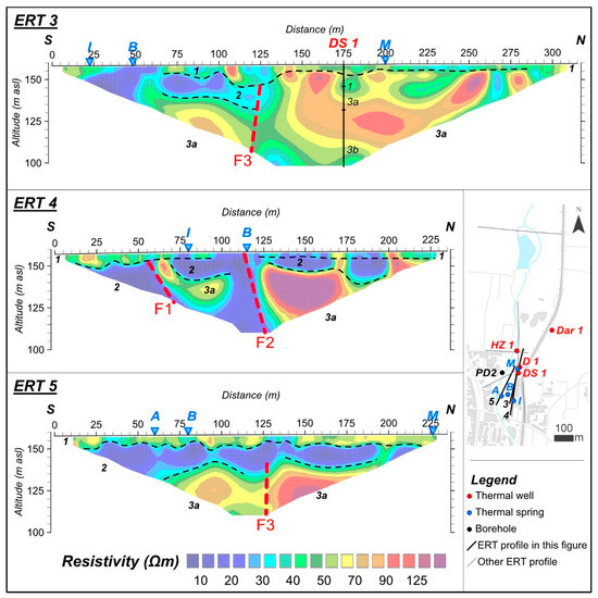 Figure 5 shows the profiles investigating the spring area conducted using a spacing between electrodes of 5 m. Data inversion resulted in an RMS error of 4.1%, 12.4%, and 5.6% for ERT 3, ERT 4, and ERT 5, respectively.