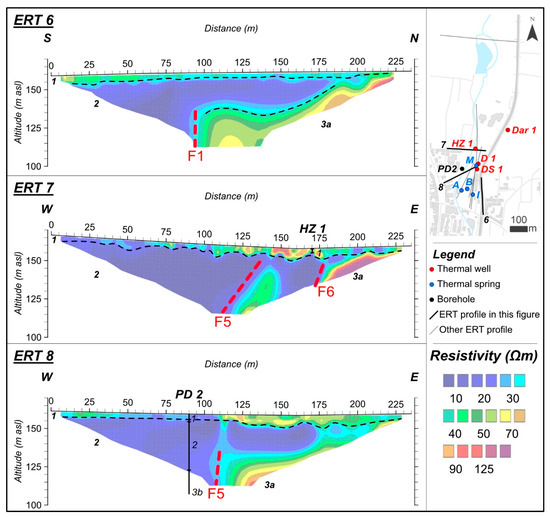 Figure 6 shows the profiles with spacing between electrodes of 5 m providing an overview of the north-western (i.e., ERT 7 and ERT 8) and south-eastern parts (i.e., ERT 6) of the spring area. Data inversion resulted in an RMS error of 3.5%, 6.5%, and 2.9% for ERT 6, ERT 7, and ERT 8, respectively.