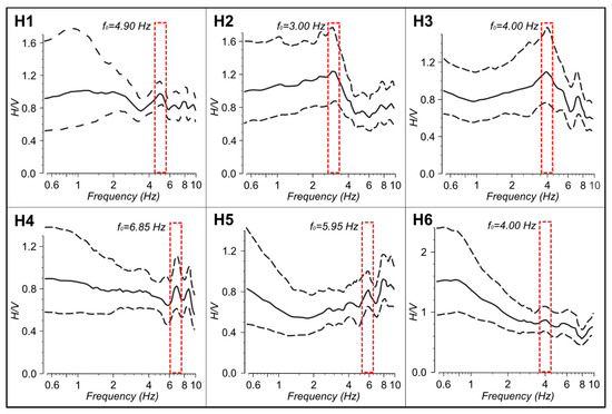 H/V spectral ratio measured at the stations H1 to H6. The black solid line represents the average of the H/V ratio, while the black dashed lines indicate the minimum and maximum values. The red dashed box highlights the first peak in the curve that was used to determine the thickness of first seismic layer. The locations are shown in Figure 2, while the coordinates are in Table 2.