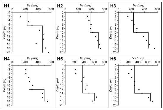 The observed Vs were grouped based on the Vs values (black lines in Figure 8). Two seismic units can be distinguished. The thickness of the first seismic unit varies from 6 to 14 m, showing Vs from 190 to 356 m/s. Vs values in the second seismic unit range from 253 m/s to 654 m/s. It should be noted that H2 shows the lowest Vs values for both the first and the second seismic units.
