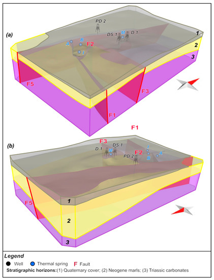 3D geological model of the Daruvar thermal spring area (view from SE and NW in (a) and (b), respectively). Three stratigraphic units and four faults were identified. Acronyms of springs and wells are in Figure 2.