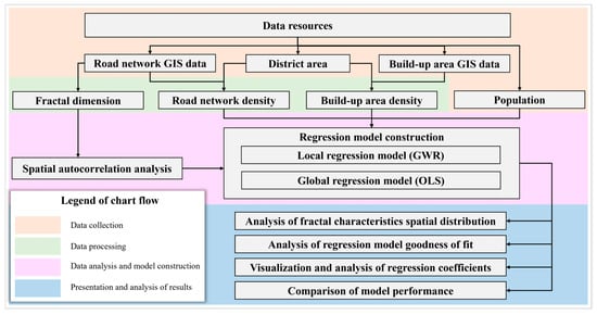 The remainder of this paper is organized as follows: The second section provides a review of fractal geometry theory and its applications in urban road network studies. The third section presents the methodology and introduces the study area, data collection and processing, and relevant theories. The corresponding flowchart is shown in Figure 1. The fourth section presents the results and conducts a systematic analysis and discussion of the findings. The fifth section provides the conclusions, summarizing the achievements of this study.