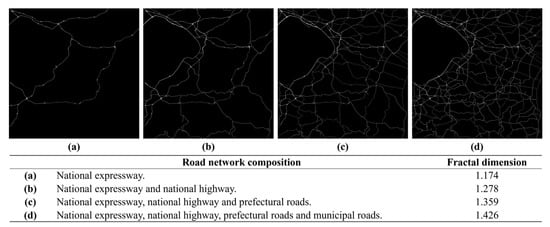 Fractal geometry has provided a new perspective for studying urban road network morphology. Urban road networks with stronger fractal characteristics, characterized by higher fractal dimensions, tend to have more well-developed branching structures, thus being easier to achieve [,]. Therefore, researchers have focused on factors that influence the fractal characteristics of urban road networks. It has been found that the fractal characteristics of urban road networks are influenced by various factors, mainly divided into two aspects: The first is road network scale. The fractal dimension essentially measures the filling efficiency of the road network in urban space, making a relatively larger road scale a necessary condition for achieving a higher fractal dimension in urban road networks [,]. Abid found a significant positive correlation between the fractal dimension of urban road networks and road length [,]. The second is the characteristics of a city. Lu et al. analyzed the relationship between the fractal dimension of urban road networks and urban indicators such as population and the number of buildings and found that the fractal dimension of urban road networks increases with urban expansion []. Moreover, Lan et al. attempted to investigate the allometric relationships between the fractal dimension of urban road networks and urban development indicators []. Subsequent studies have confirmed that urban indicators such as population size and building density have an impact on the fractal characteristics of urban road networks.