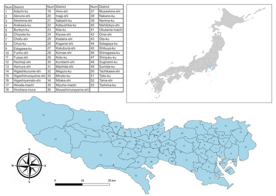 - Population Estimates of Tokyo Metropolis; Statistics Division, Bureau of General Affairs: Tokyo, Japan, 2023.
