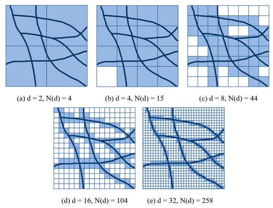 The box-counting method was selected to calculate the fractal dimension; it is a common method based on the Hausdorff dimension [,]. As shown in Figure 5, taking a square map of a road network as an instance, assume the side length of the road network map is 1, take a square grid with width 1/d to cover the road network map, and record the number of boxes N(d) that cover the road object. By progressively increasing the value of d and recording N(d), we can analyze the relationship between the grid width and the number of boxes covering the road network. If the set has fractal characteristics, the scatter plot of d as the independent variable and N(d) as the dependent variable will follow a straight line with a negative slope −D in the log–log coordinate system []. The value of D is the fractal dimension of the road network (see Equation (1)).