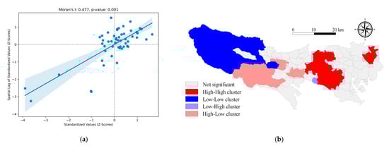 The results of the spatial autocorrelation analysis of the fractal dimensions are presented in Figure 7. The global Moran’s index was calculated as a value of 0.477, which is statistically significant at the 1% level, as shown in Figure 7a, and the distributions of hotspots and coldspots are shown in Figure 7b. The results show that positive correlation aggregation was observed in approximately 25% of the regions. Specifically, the western area of Tokyo special wards and Katsushika-ku (i.e., the red area in Figure 7b) exhibit a significant High–High pattern, indicating that the fractal dimension of urban road networks in these regions exhibits high-value clustering. The western area of Tokyo (i.e., the blue area in Figure 7b) exhibits a significant Low–Low pattern, indicating that the fractal dimension exhibits low-value clustering. It is evident that the fractal characteristics of urban road networks do not exhibit a random spatial distribution but rather demonstrate significant spatial dependence. This is manifested by the non-uniform and clustering patterns observed in the west–east direction.