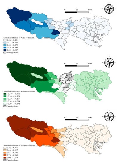 The adjusted R-squared of the local model based on GWR is 0.861, indicating that the explanatory variables account for 86.1% of the variance in the fractal dimension of the road network. The summary of standardized regression coefficients is presented in Table 5. These results indicate a positive correlation between the fractal dimension and the explanatory variables covering POP and RND, suggesting that an increase in population or road network density will enhance the fractal dimension of the urban road network. On the other hand, there is a negative correlation between the fractal dimension and BAD, implying that dense land use for building suppresses the increasing fractal dimensions of the road network to some extent. The average coefficient of RND is 0.519, indicating the greatest impact on the fractal dimension of the road network, and the average coefficient of RAD is −0.216, indicating the smallest impact. The standard deviation of POP is 0.027, which is the smallest among the three explanatory variables, indicating that the impact of POP on the fractal dimension of the road network is the most stable across the study area. The standard deviation of RND is 0.249, which is much higher than POP and RAD, indicating that, despite RND having the largest impact, spatial differences are also the greatest.
