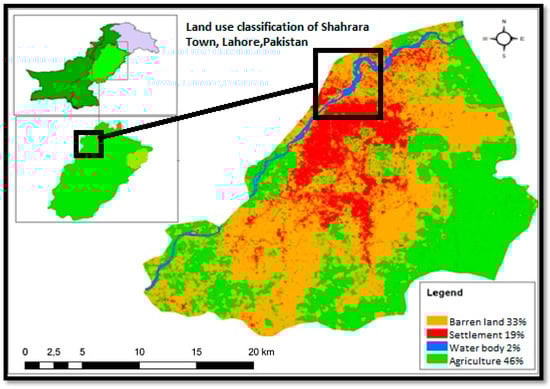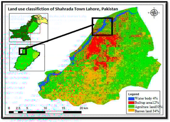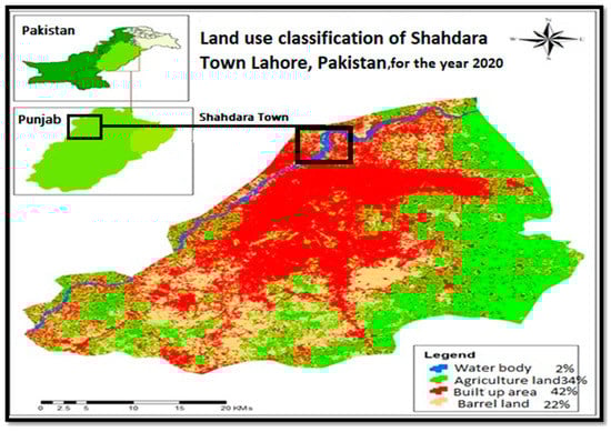 Figure 3 shows the percentage of land use characteristics, which shows that the area (Shahdara Town, indicated in the box colored in black) has the highest percentage of agricultural land, 50%, and 34% of barren land for 2001. The percentage of built-up area is 12% of the total, along with 4% water bodies of total area in 2001. This map will provide a base from which the study will further examine the impacts of urbanization on land use changes through the classification of the study area with temporal variations in different time series, for example, from 2001 to 2020. The trends of urbanization in Lahore city impact all parts of the city, including the study area, Shahdara Town.