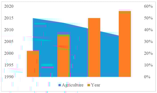 The results in the above table express that the rate of agricultural production is decreasing gradually over time. In 2001, agriculture production was recorded at 50%. Meanwhile, in 2008 and 2015, this percentage decreased to 46% and 40%, respectively. In 2018, agriculture production was at 34%. The production ratio is decreasing due to the conversion of agricultural land into residential areas, which reduces arable land, as shown in Figure 1 in the land use classification maps of the study area.