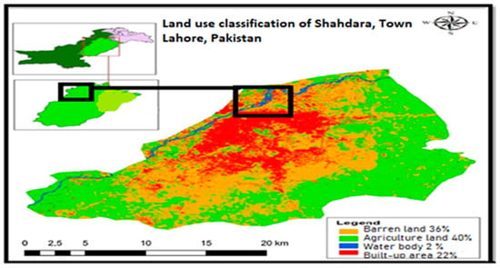 There is a strong need to examine the impacts of land use change on local environment for urban sustainability and environmental development. Figure 1 shows the land use of Shahdara Town, Lahore, according to which the major portion of the city boundary consists of urban built-up that grows gradually and directly, causing the shrinkage of agricultural land along with the loss of biodiversity in the region. Urban agriculture not only provides food to meet the demands of the locals but also increases urban green infrastructure and biodiversity [38].