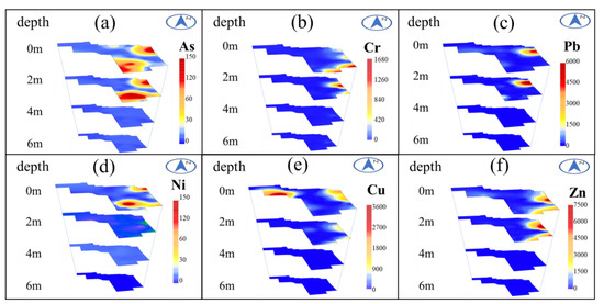 Figure 2. Spatial distribution of heavy metals in the soil profile, (a), (b), (c), (d), (e), and (f) represent As, Cr, Pb, Ni, Cu, and Zn, respectively.