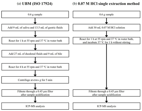 Oral bioaccessibility indicates the fraction that can be absorbed by the human body upon the ingestion of metals contained in confined matrices and can be used as an indicator of reliable human health risk, being better than total metal concentrations. The amount of metal actually absorbed through the gastrointestinal tract can be applied for human health risk assessment, considering relative bioavailability (RBA), through in vivo assays but faces many economic and ethical limitations [6,7]. In this regard, in vitro test methods have been proposed to determine the bioaccessibility of metals in confined matrices, with a high correlation with in vivo assay results. The various test methods with a good in vitro–in vivo correlation (IVIVC), which were suitable for assessing the oral bioaccessibility of metal-contaminated soil, include the in vitro gastrointestinal method (IVG) [8], the physiologically based extraction test method (PBET) [9], OSWER 9285.7-77 of the United States Environmental Protection Agency (USEPA) [10], ISO 17924 of the International Standards Organization (ISO) [11], and DIN 19738:2 of the Deutsches Institut für normung e.V. (DIN) [12]. One can assess the oral bioaccessibility of children’s products through BS EN 71-3 of the British Standards Institution (BSI) [13], simulating gastric juice with 0.07 M HCl; EUR 19899 EN of the Joint Research Centre European Commission (JRC) [14], simulating saliva with MgCl2, CaCl2, K2HPO4, K2CO3, NaCl, and KCl; and Report 320102004 of the National Institute for Public Health and the Environment (RIVM) [15], using human body fluids containing 12 inorganics, 4 organics, and 8 enzyme components. Among them, ISO 17924, also known as the unified Bioaccessibility Research Group of Europe (BARGE) method (UBM), is one of the most detailed simulations of human digestive juices and their processes.