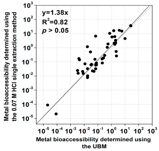 Figure 2 shows an excellent linear relationship of the all the metal/metalloid bioaccessibility results determined using the UBM and 0.07 M HCl single extraction (R2 = 0.82) method. The slope of the linear regression was 1.38 (Figure 2), indicating that the 0.07 M HCl single extraction has potential for conservative assessment. The bioaccessible concentrations of all the metals/metalloids in all the CRMs determined using the UBM and the 0.07 M HCl single extraction method ranged from 0.002 to 17,449 mg/kg and from 0.003 to 20,283 mg/kg, respectively (Table 3). The bioaccessibility obtained with the UBM and the 0.07 M HCl single extraction method ranged from 0.00002 to 26.9% and from 0.00002 to 36.6%, respectively (Table 4). Overall, the bioaccessible metal/metalloid concentration and the bioaccessibility obtained using the 0.07 M HCl single extraction method were slightly higher than those obtained using the UBM. However, the results of Student’s t-test using the two methods, for all the metals/metalloids, did not show a statistically significant difference (p = 0.24). Pelfrêne et al. [17] confirmed that the 0.65% HCl extraction method could be used to effectively replace the UBM when testing 201 metal contaminated soils, and the R2 values of the linear correlations for As, Cd, and Pb were 0.91, 0.97, and 0.72, respectively. Based on these results, the HCl single extraction method has been used to determine metal bioaccessibility in soil [21,22]. Rodrigues et al. [19] also attempted to develop a single extraction method using 0.43 M HNO3 as an alternative to the UBM and observed that the bioaccessibility values of Ba, Cd, Cu, Ni, Pb, and Zn in 204 soil samples assessed using the UBM were highly correlated with those obtained using the 0.43 M HNO3 extraction method (R2 = 0.82–0.94). Similarly, the relatively simple 0.07 M HCl single extraction method can be used as an in vitro test method to assess the oral bioaccessibility of metals/metalloids in various consumer products, replacing the UBM.