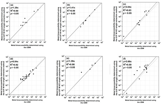 Linear relationships between the metal bioaccessibility determined using the UBM and the 0.07 M HCl single extraction method: (a) Cd, (b) Cr, (c) Pb, (d) plastics, (e) paints, and (f) metals. The dotted and solid lines indicate the 1:1 line and linear regression, respectively.