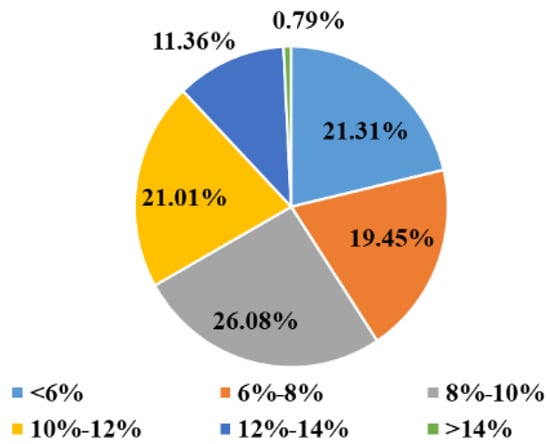 The target block of the simulation is the M block tight oil reservoir. The main oil reservoir is the C1 reservoir with a depth of 2070 m and an average effective oil thickness of 12.5 m. The target reservoir is dominated by feldspar lithic sandstone and lithic feldspar sandstone. The pore is mainly the solubility-intergranular combination type, and the brittleness index of the reservoir rock is 35–40% []. The porosity of the C1 reservoir in the target block is mainly distributed in 8–10%. The permeability is mainly distributed below 0.05 mD. The average porosity and permeability are 9.9% and 0.13 mD, respectively. The distribution of porosity and permeability are shown in Figure 1 and Figure 2. The original formation pressure of the target reservoir is 15.8 MPa, with a horizontal stress difference between two directions of 5–8 MPa and a more developed natural microfracture in the reservoir.