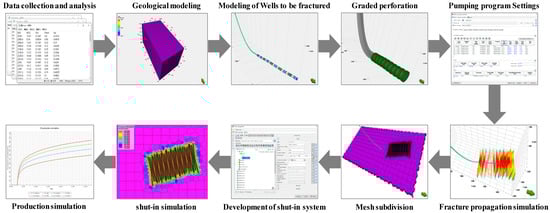 The integrated model includes a geological model of the target block, a hydraulic fracture extension model, a shut-in and production model. The modeling workflow is shown in Figure 3. First, data on the target block need to be collected, and geological modeling and well construction need to be performed as required. Then, a hydraulic fracturing simulation can be performed after completion of a perforation and pumping program design. Before shutting in well, it is necessary to divide the grid to display the fracture extension simulation results. A well shut-in simulation can be performed after completion of the shut-in system design. Finally, for production, the output can be calculated according to the production system.
