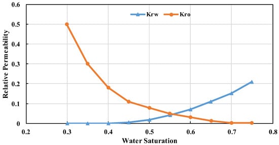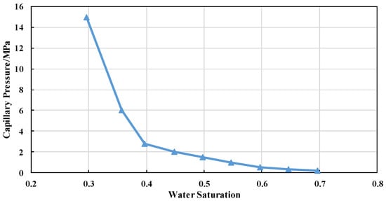 The rock physical parameters and fluid physical parameters of the model are designed based on the actual data of the target block, and the specific data are shown in Table 1. The relative permeability curve used were obtained from the core experiments, and the oil–water relative permeability curves are shown in Figure 7. The matrix capillary pressure used was obtained from the core mercury injection experiment, and the matrix capillary pressure curve is shown in Figure 8.