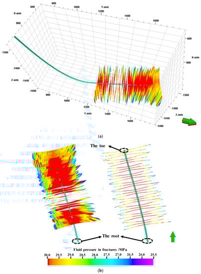 (6) Hydraulic fracturing simulation. After completing parameter input and design, hydraulic fracturing simulation can be performed. The distribution of fractures without natural fractures is shown in Figure 9. When there are natural fractures, take the natural fracture FN1 as an example, and the distribution of fractures is shown in Figure 10.