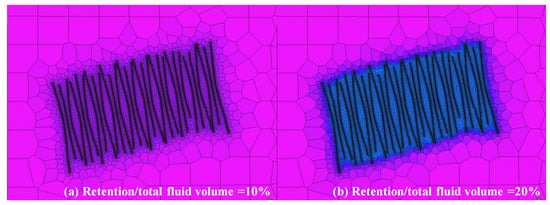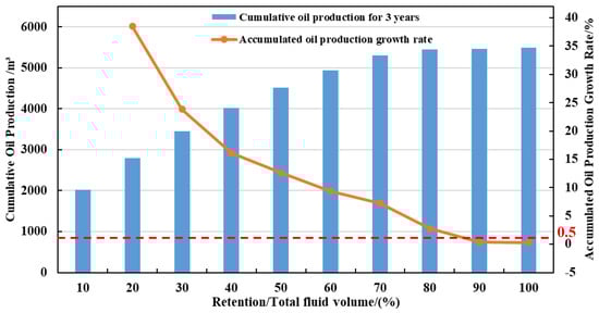 According to the above results, the relationship of cumulative oil production and its increase under different fluid volumes is shown in Figure 16. It can be seen that the cumulative oil production increases with the increase in retained fluid. When the ratio of retained fluid volume to total fracturing fluid volume equals 30%, the increase of cumulative oil production starts to decrease, but the cumulative oil production is still relatively significant. When the ratio of retained fluid volume to total fracturing fluid volume is greater than 80%, that is, when the retained fluid volume exceeds 9600 m3, the increase in cumulative oil production has been reduced to 0.36%. When the increase of cumulative oil production is less than 0.5%, increasing retained fluid has little effect on increasing production. According to the model, the optimal fluid volume is 9600 m3.