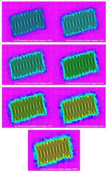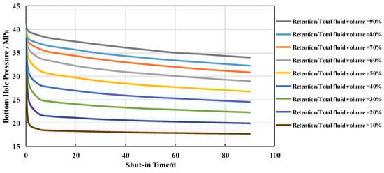 The variation in bottom hole pressure at different fluid volumes is shown in Figure 13. It can be seen that the more retained fluid, the higher the initial pressure at the bottom of the well. The rapid flow of fracturing fluid in the fracture network at the beginning of shutting in well causes a rapid drop in bottom hole pressure. The less fracturing fluid is retained, the greater the reduction rate. In the later period, fracturing fluid diffused into the reservoir matrix and the rate of bottom hole pressure reduction slowed. The more retained fluid, the higher the bottom hole pressure at the end of well shut-in.