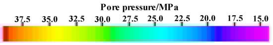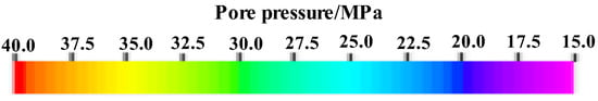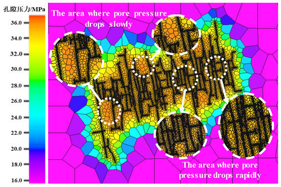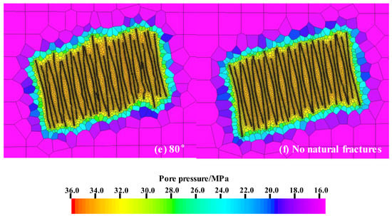 The pore pressure distribution of the reservoir matrix in different natural fracture angles is shown in Figure 29. It can be seen that the matrix pore pressure around the fracture network exhibits a non-uniform variation. The smaller the natural fracture angle, the more complex the fracture network and the more obvious the non-uniform variation in pore pressure. Take the pore pressure variation when the natural fracture angle is 0° in Figure 30 as an example (partial enlargement of Figure 29a). The denser the fracture network, the faster the fracturing fluid diffuses into the matrix, and the faster the pore pressure decreases, as the light-colored area in the figure. The thinner the fracture network, the slower the fracturing fluid diffuses into the matrix, and the slower the pore pressure decreases, as the dark-colored area in the figure. The matrix pore pressure around the fracture network tends to vary uniformly when the natural fracture angle exceeds 40°.