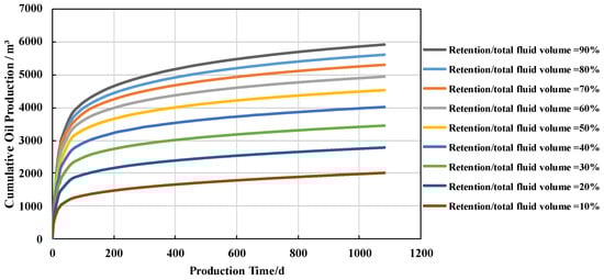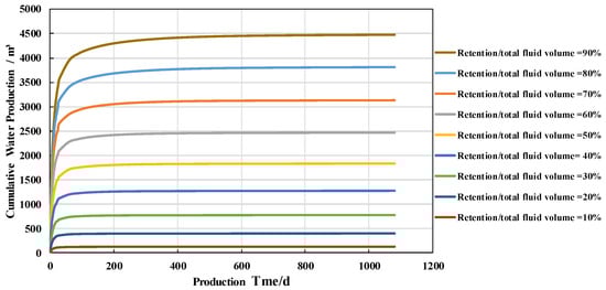To determine the optimal retained fluid volume, production is performed after shutting in well. The changes in cumulative oil production and cumulative water production under different fluid volumes are shown in Figure 14 and Figure 15. It can be seen that the cumulative production all showed a trend of rapid increase in the early stage and a gradual, slowdown increase in the later stage. The more retained fluid, the more cumulative oil production, but the increase in cumulative oil production gradually decreases.
