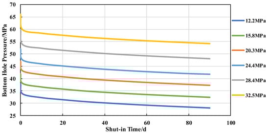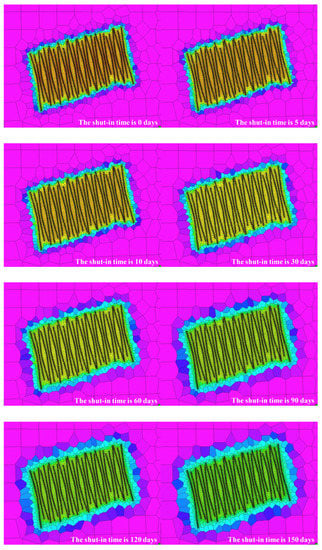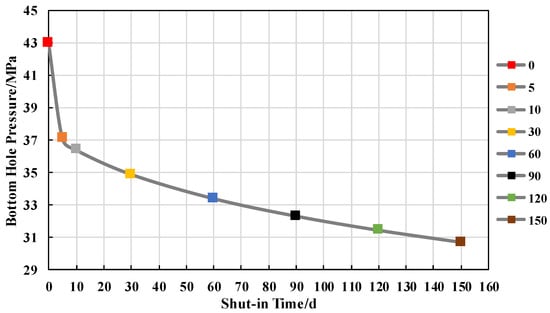 The variation in bottom hole pressure at different shut-in times is shown in Figure 18. The rapid flow of fracturing fluid in the fracture network at the beginning of shutting in well causes a rapid drop in bottom hole pressure. The bottom hole pressure of the well shut-in for 5 days was reduced by about 6 MPa, compared to that of the initial period. In the later period, fracturing fluid diffused into the reservoir matrix and the rate of bottom hole pressure reduction slowed. The bottom hole pressure of the well shut-in for 150 days was reduced by about 12 MPa, compared to that of the initial period.