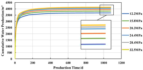 The changes in cumulative oil production and cumulative water production under different original formation pressures are shown in Figure 24 and Figure 25. It can be seen that the lower the formation pressure coefficient, the higher the cumulative oil production and the lower the cumulative water production. The abnormal low pressure formation with a formation pressure coefficient of 0.6 increased cumulative oil production by about 700 m3, compared to the abnormal high pressure formation with a formation pressure coefficient of 1.6 after shutting in well. It indicates that well shut-in is more effective in supplementing the energy of abnormal low pressure formations and can produce more tight oil compared to normal pressure formations and abnormal high pressure formations.